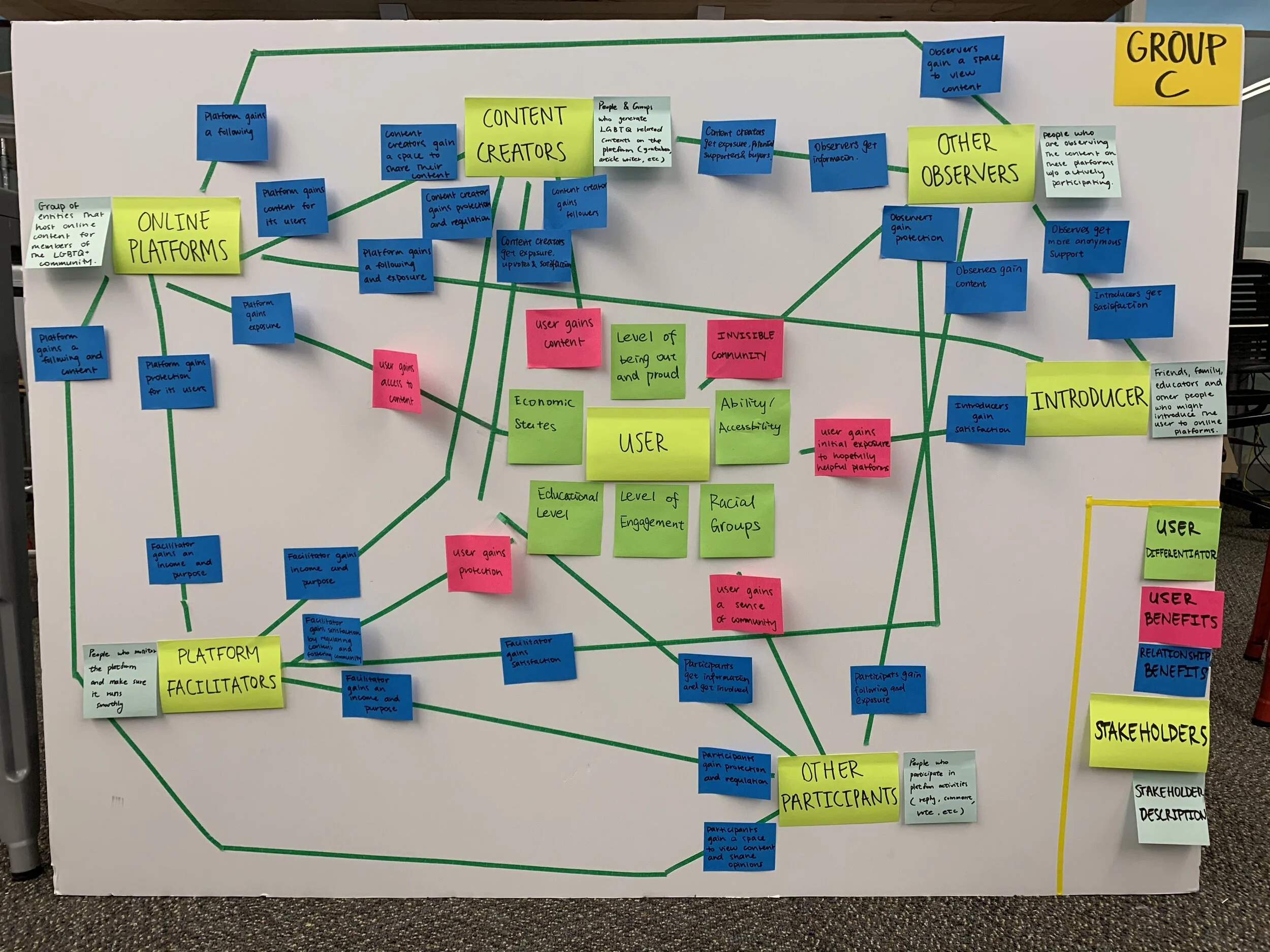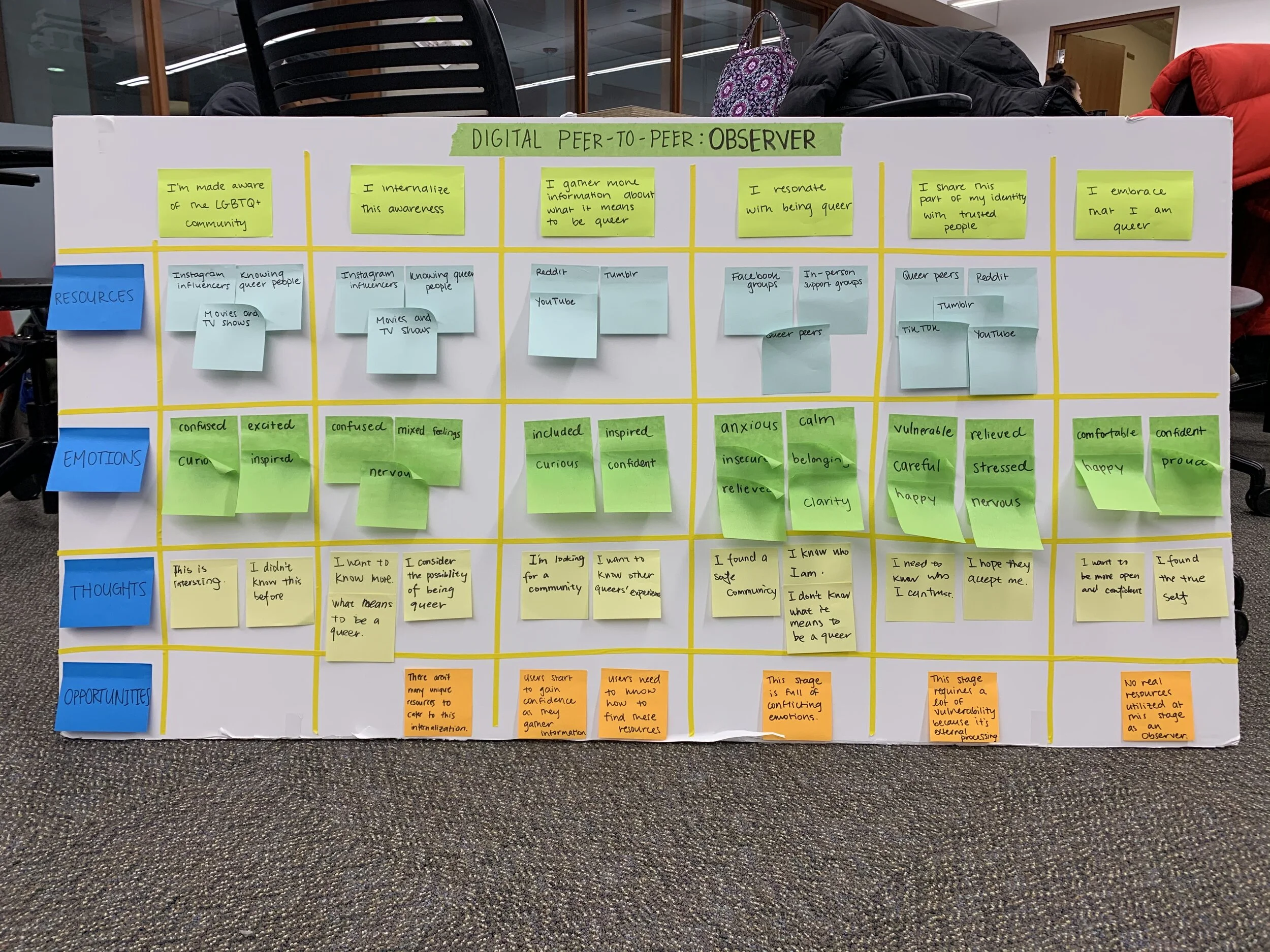 At the start of this project my team was told to focus on digital peer-to-peer resources used by LGBTQIA+ young adults, particularly focusing on the observer using these platforms. In order to better understand this segment we created stakeholder and ecology maps. With the stakeholder map we mapped out the relationships between different parties in our ecosystem and placed a specific focus on the benefits of the primary user. With our ecology map we broadened this scope and did some research into questions of where the services in this segment are being used, why they are being used, when they are being used, how they are being used and who is using them. Learnings from these maps, including the role of other participants on the platforms and the expansiveness of the platforms, inspired our discussion guide for our 4 user interviews with queer young adults. We conducted these interviews to learn more about the coming out experience and their use of digital peer-to-peer resources during this time. After gathering all of our findings we created a journey map that outlined the different stages a queer young adult must go through when they are coming out. From our journey map we took away the key insight that queer young adults experience very conflicting and hard to process emotions during this time.